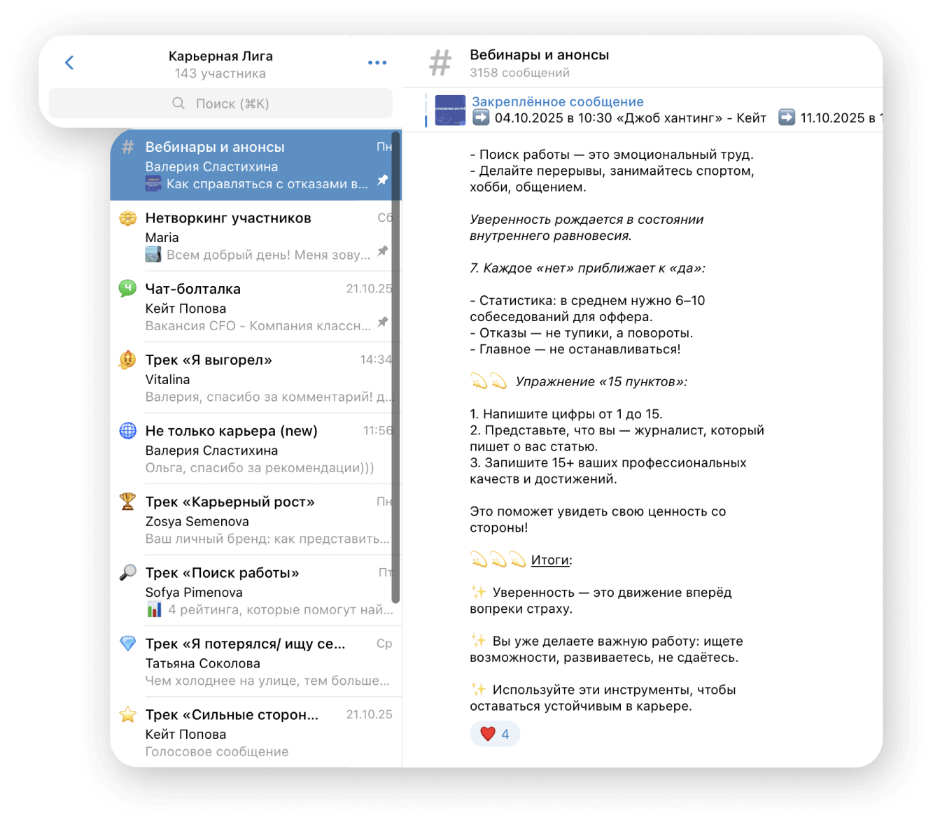 Ещё мне понравилось, что в ней затронуты психологические аспекты, которые нужно принимать во внимание во время поиска и как с ними справляться. Я с этим столкнулась сама, как начала искать работу, что поиск должен начинаться из состояния баланса, а не выгорания, тогда точно ждёт успех ))